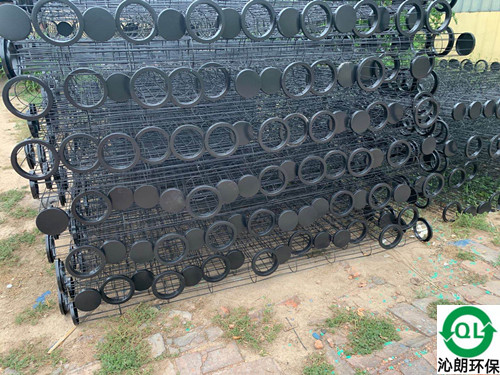 圆袋型除尘框架(外滤式)采用专用设备一次焊接成型,其特点:焊接牢固,外表光洁挺直。滤袋骨架的加工、运输及安装都应执行机械工业部标准JB/T 5917—91l“袋式除尘器用滤袋骨架技术条件”,除尘器骨架主要要求:滤袋骨架应有足够的强度、刚度、垂直度和尺寸的准确度,以防受压变形,运输中损坏、滤袋装入除尘器后相互接触以及装袋困难、袋框摩擦等情况的发生;所有的焊点牢固,不允许有脱焊、虚焊和漏焊;骨架与滤袋接触的表面应光滑,不允许有焊疤凹凸不平和毛刺;滤袋骨架表面做防腐处理,可用喷塑、涂漆或电镀,用于高温的防腐处理剂应满足高温的要求。
