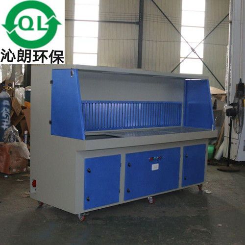 打磨工作台,是一种集工作台与除尘器为一体的工业除尘设备。打磨工作台适用于中小型精细加工、不规则部件加工工况。在不干涉工人日常作业的前提下,打磨工作台可有效捕集悬浮的细小尘埃,给工人提供洁净健康的工作环境 除尘工作台的工作原理 当烟雾尘通过风机所产生的负压经侧排风口和下排风口进入净化器,气流进入导流通道,大颗粒粉尘与导流板碰撞后,大颗粒粉尘在重力的作用下落入集灰抽屉,含细小颗粒的粉尘进入过滤室,含尘气体由滤袋外表面穿过滤芯,粉尘则被滤芯阻拦在其表面,当被阻拦的粉尘在滤芯表面不断沉积时,通过脉冲喷吹对滤筒清灰使得沉积在滤芯上的粉尘颗粒在振动的作用下脱离滤芯表面落入集灰抽屉中,落下集灰抽屉中的粉尘需要定期进行清理 打磨抛光除尘器采用独特的工作台设计,顶面排风,内置式除尘系统,风机有隔音处理,无须管道连接,可直接在工作台进行工作。因这种既能有效捕捉细小粉尘和悬浮尘埃而且又不干涉工人的移动和视野,非常适用于中、小型精细加工、不规则部件打磨和抛光时所产生的粉尘处理与收集。 沁朗环保设备打磨台优点: 1.一体化的滤筒,对粉尘(0.3μm)的过滤效率可达99.97%,并能保持的气流量。打磨工作台进风口处设置导流板,可防止含尘气流直接冲击滤芯,延长滤芯的使用寿命。 2、抽风工作台进风口处设置一导流板,用于防止含尘直接冲击滤芯,从而延长滤芯的适用寿命。 3.风机采用离心风机,运行平稳等特点。 4、为了防止噪声污染,对风机采取降噪处理。 5.集工作台与除尘功能于一身,直接从源头进行处理。结构紧凑,占地面积小,可双工位或多工位同时作业。 6.可根据粉尘性质合理选择过滤媒介,以满足对不同性质粉尘的捕集。滤筒的使用寿命长,性能稳定,更换方便。 7.配置新型低噪音风机,吸风量不变,而噪音低。可保障操作者的身心健康。脉冲反吹式自动清灰,可保障设备处于良好工作状态。 8.抽屉式集尘箱,倒灰快捷、方便。.清晰简单的操作面板。 9.台式设计,内置式除尘系统,风机隔声,无须管道连接,清洁后的空气可在室内循环排放。 10.打磨工作台既能捕捉细小悬浮尘埃而又不干涉工人的移动和视野,它是中、小型加工、不规则部件的理想选择。它可烟尘净化器连接,又可与中央式烟尘系统连接。